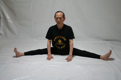 「八段錦」の七番目(贊拳怒目)気力を充実させる行法を実践しているところ。(下下)